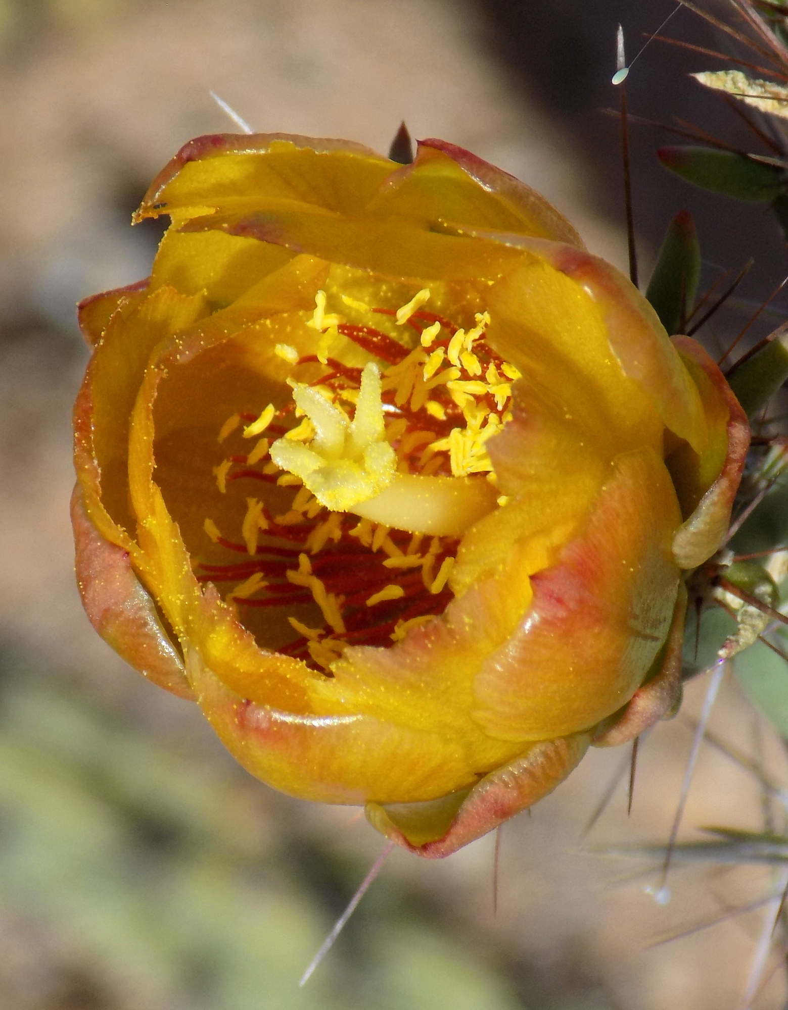 The plants are shrubs to tree-like shrubs, growing up to 2 m tall and occasionally larger. The terminal stems are firmly attached and are 10 to 50 cm long by 2 to 3 cm wide with 6 to 20 yellow, tan, or red-brown spines, aging grey.  The sheaths are white to grey with yellow tips. Flower color ranges from yellow to bronze to dark red. The filaments are dark red, and the styles range from light pink to dark red. The fruits are dry and sparsely to densely spiny.