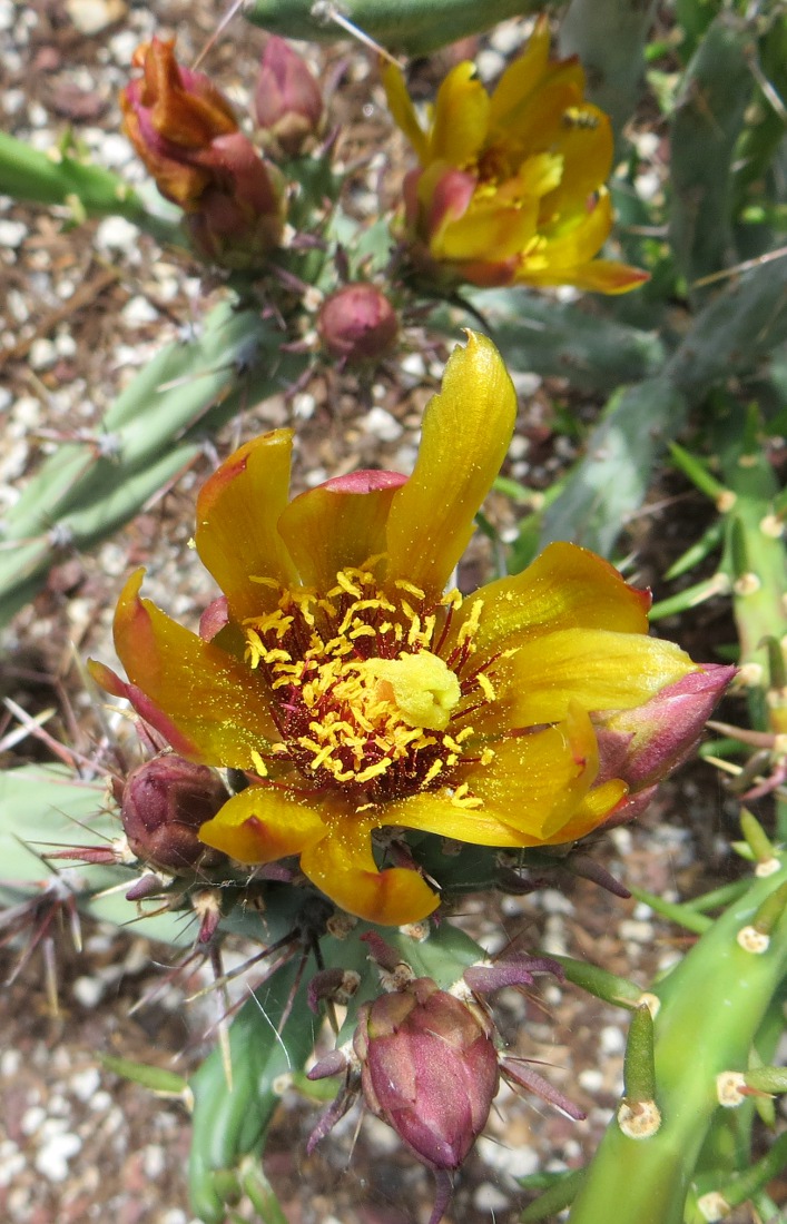 The plants are shrubs to tree-like shrubs, growing up to 2 m tall and occasionally larger. The terminal stems are firmly attached and are 10 to 50 cm long by 2 to 3 cm wide with 6 to 20 yellow, tan, or red-brown spines, aging grey.  The sheaths are white to grey with yellow tips. Flower color ranges from yellow to bronze to dark red. The filaments are dark red, and the styles range from light pink to dark red. The fruits are dry and sparsely to densely spiny.