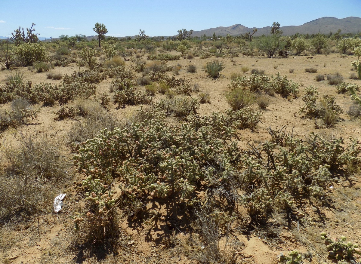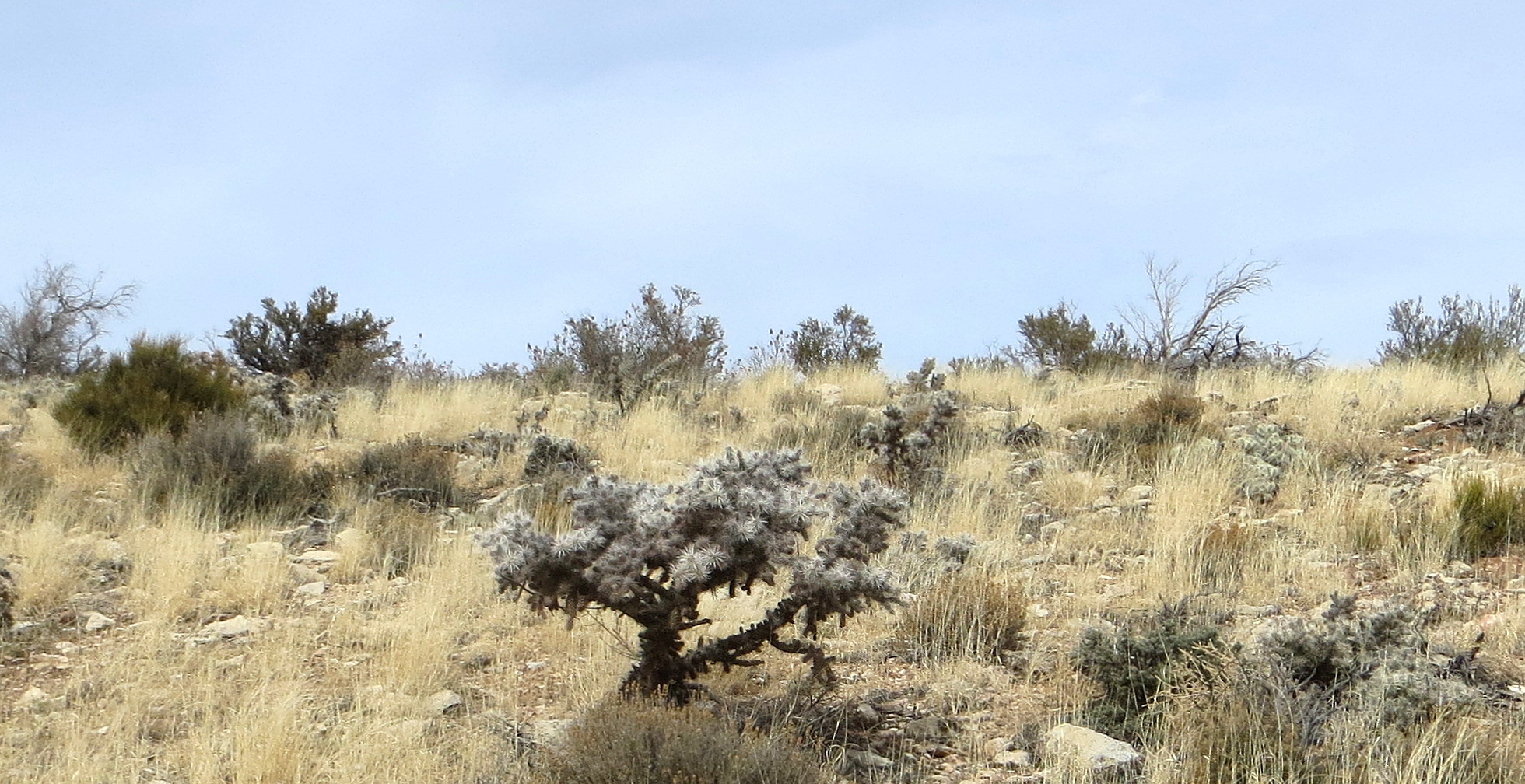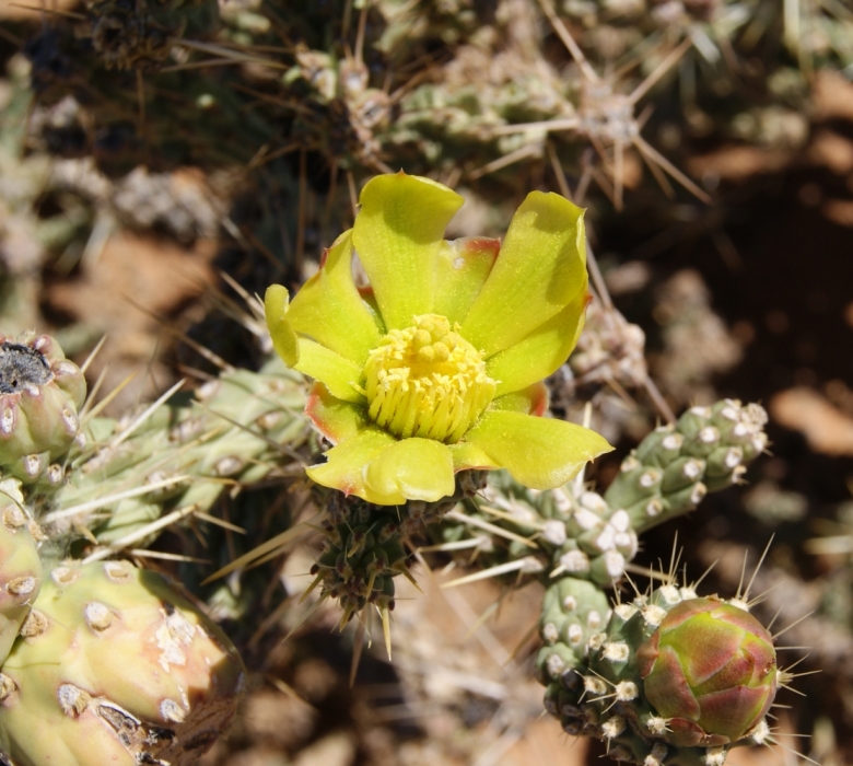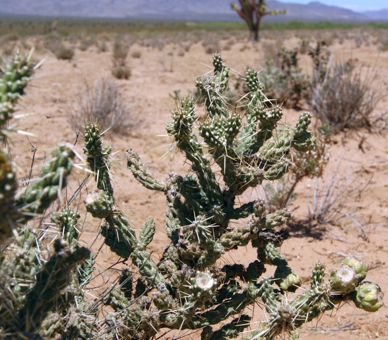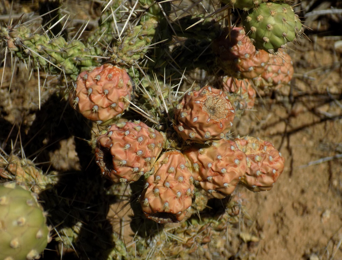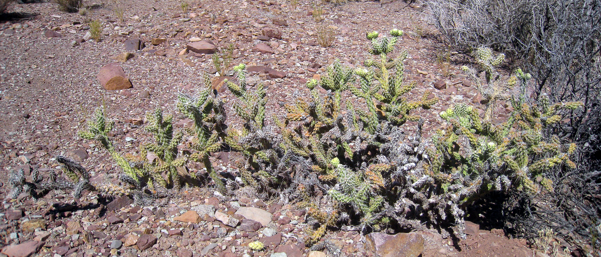 A population of Cylindropuntia whipplei near Grand Canyon Caverns was originally designated “Opuntia hualpaensis” by Hester in 1943. Plants in this area are a mixture of diploids and tetraploids and are generally morphologically intermediate between G. whipplei var. whipplei and G. whipplei var. enodis. It is therefore hypothesized that this is where G. whipplei var. enodis originated as an autotetraploid (Baker 2016, in press).