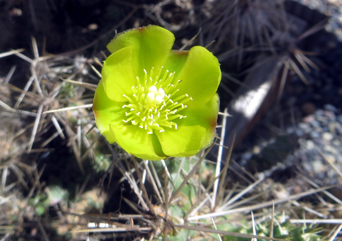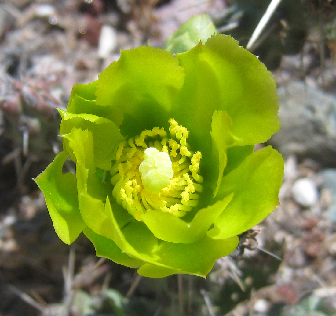 G. whipplei varies in its habit from very small, mat-like shrubs to tree-like shrubs up to 1 m tall. The stems are firmly attached and range from 3 to 9 cm long by 0.5 to 1.5 cm wide. The areoles generally have 3 to 8 white, yellow, or pale red-brown spines, and sheaths are white to pale yellow. Many areoles have 3 to 6 spines with white to yellow sheaths. The flowers and filaments are greenish-yellow with white, yellowish, or pale green styles and stigmas. The fruits are yellow to green, fleshy, and spineless.