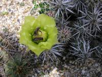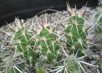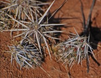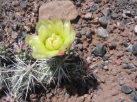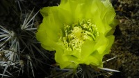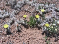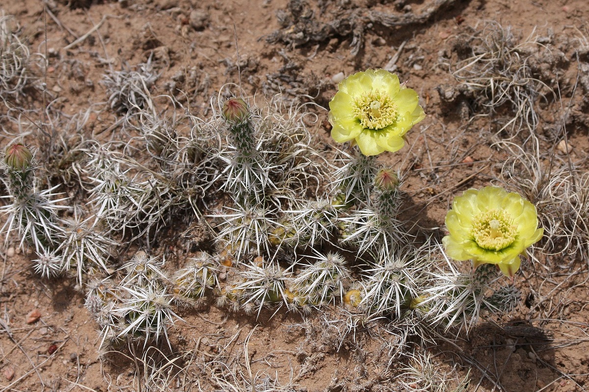 G. clavata forms mats of club-shaped cladodes and spread to over 1 m across. Cladodes are short-clavate and strongly narrowed at the base: 2.5-5(8) x 1.5-3 cm. Oval areoles about 3 mm in diameter form on prominent tubercles that are 5-10(16) mm long, and 4-6 times longer than wide. There are 7-15 spines per areole, primarily in the distal areoles. Some (3-5) major abaxial spines are deflexed and flattened; the longest central spine is dagger-like and broadly tapered (12-35 × 1.5+ mm basally). There are 1-3 ascending adaxial major spines. Spines are white, dull-white, or yellow to tan, and angular-flattened to subterete. Glochids are typically pale yellow or yellowish-white and up to about 4 mm long. Due to dust, the plants are often dirty white in situ. From late summer to mid-spring the plants often appear dead because they are dirty and dehydrated. In spring, the stems turn green and the beautiful canary-yellow flowers appear. The roots are not tuberous and G. clavata is diploid.