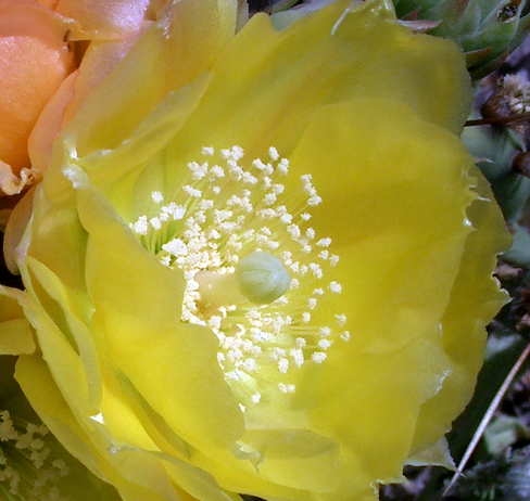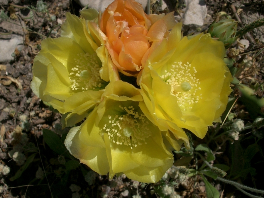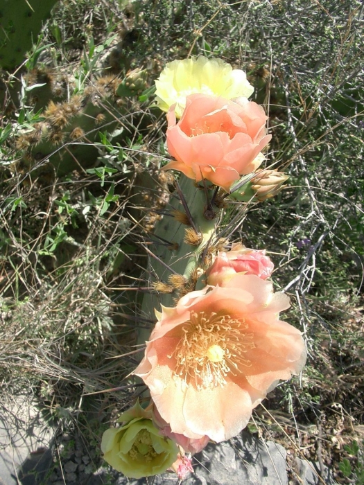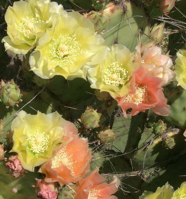 Shrubs: low to modest, mounded or loosely spreading rather than strongly trunked. Cladodes: generally obovate to elliptic for the complex; joints may taper at the attachment and can appear slightly flexuous with age. Areoles: spination variable among shoots, but spines are characteristically dark (often blackish when fresh), becoming paler with weathering; armament ranges from slender to moderately stout and can be stronger on upper pads. Glochids: present in the areoles as in other Opuntia. Flowers: open yellow and darken with age to pink, red, or salmon; it is common to see two—or even three—flower colors on a single plant at the same time. Fruits: typically obovoid to short-clavate; any fruit armament, when present, is sparse and often transient. Anthers, Filaments, Styles, Stigma lobes: as depicted on this page; use the site images for color and proportion.