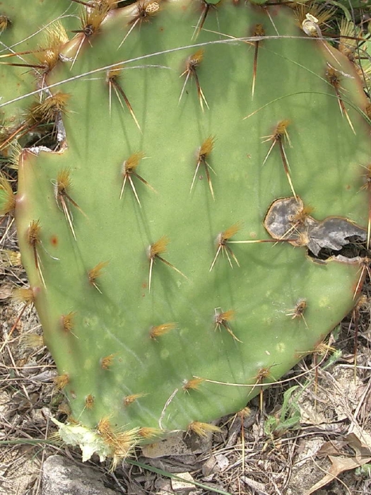 O. lindheimeri — Tends to thicker, broader cladodes and stronger, paler spination; atrispina remains darker-spined and lighter in overall build.