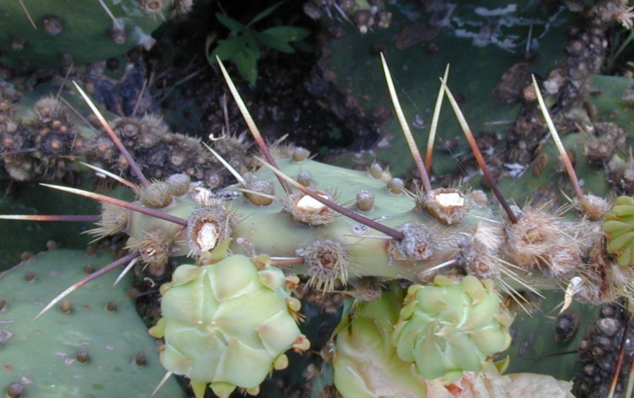 O. engelmannii — Usually larger, more robust shrubs with broader pads and heavier, paler armament; contrasts with the darker spines of atrispina.