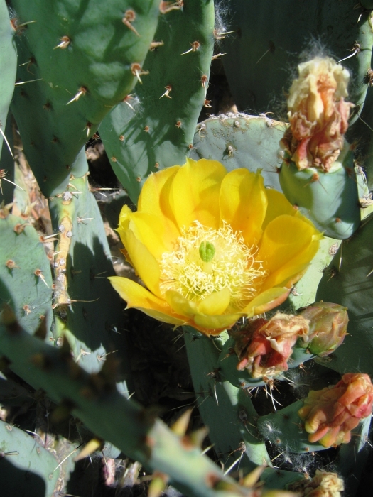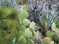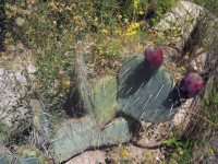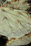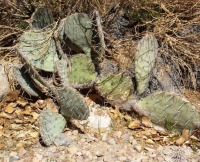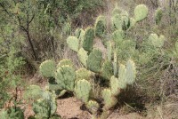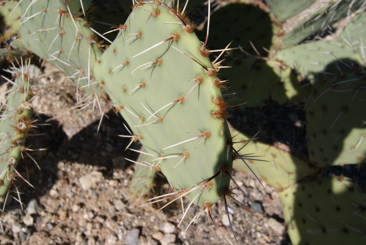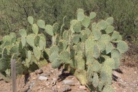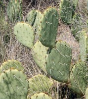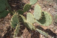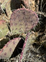 Opuntia dulcis is a more upright cactus than O. camanchica, and the spines are fewer and more slender. It is midway in size between O. phaeacantha and O. engelmannii. The pads are obovate to ovate and 16-25 cm long by 12-15 cm wide. There are 2-4 spines per areole in this prickly pear. While spines may be brown at their bases and white at the tips; they vary and may be other colors depending upon the population of this prickly pear.