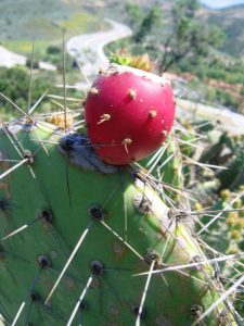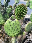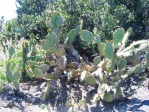 O. littoralis plants may be low and spreading, but they send branches upright to 1 m as well. The oblong or obicular cladodes are 12-15 cm across the shortest diameter. Areoles may be elevated. Spines are numerous and yellow or pale yellow and may be 1 cm long or longer. There are multiple pale spines over much of the pad surface, creating a shaggy look.