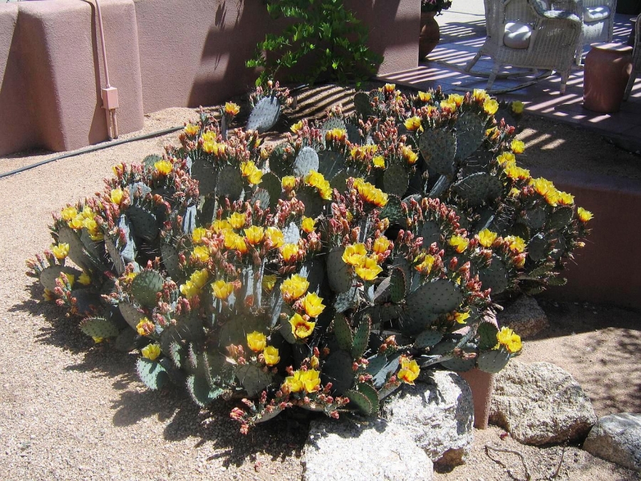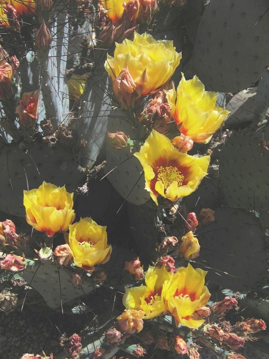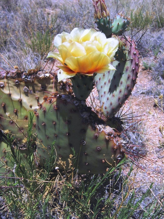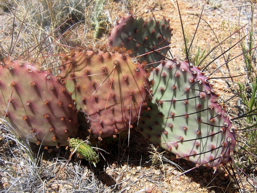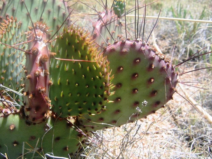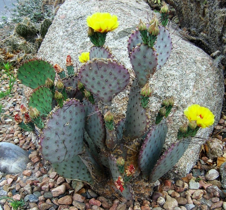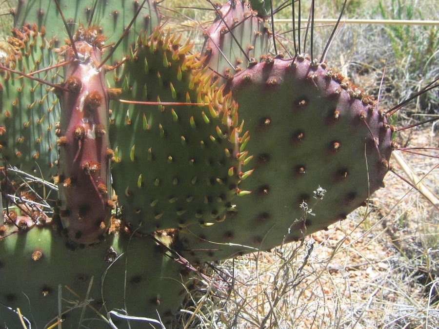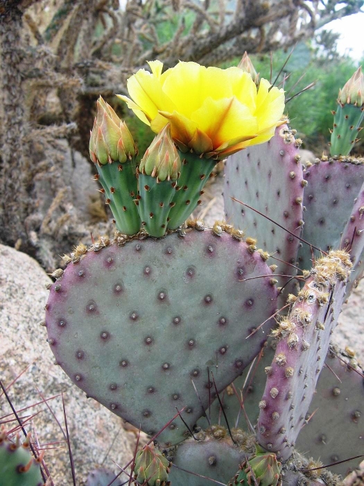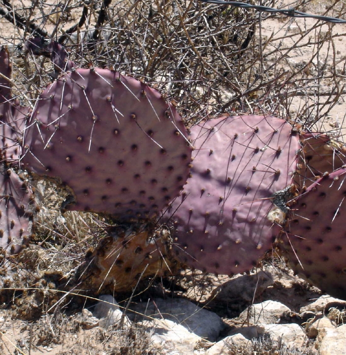 Opuntia macrocentra is a much-grown and much-enjoyed prickly pear cactus found in western gardens. It is related to O. azurea. The flowers are attractive and the pads are often bluish or purplish.