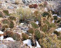 O. mojavensis forms woody-stiff plants sprawling to 1.5-2(2.5) m across. O. mojavensis has distinctly angular branches caused by its woody nature as well as sometimes-rising branches. Cladodes are irregular in size but generally obovate. The spines shown here seem similar to those of the lectotype as well as in the drawing above. However, spination is irregular, and there are 0-2(3) reflexed spines per areole, even on the same pad. Spines are usually yellow fading to reddish, but may be tan after the first season. If 2 spines, the second, lower spine is shorter and more reflexed. Plants may turn a pleasing pink or red-purple color in winter.