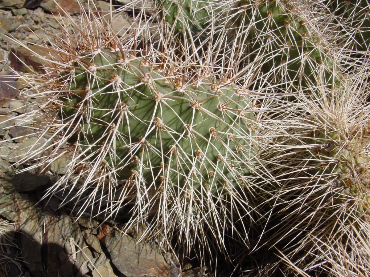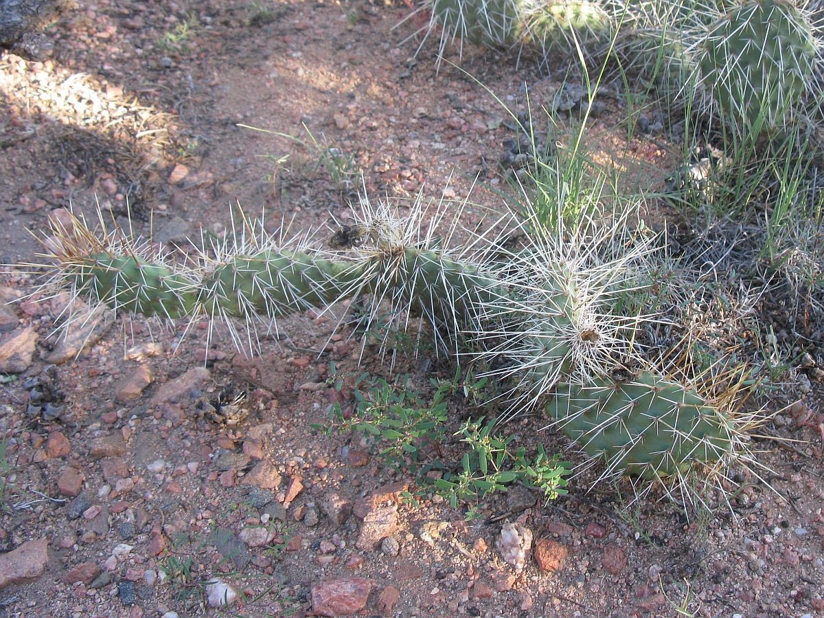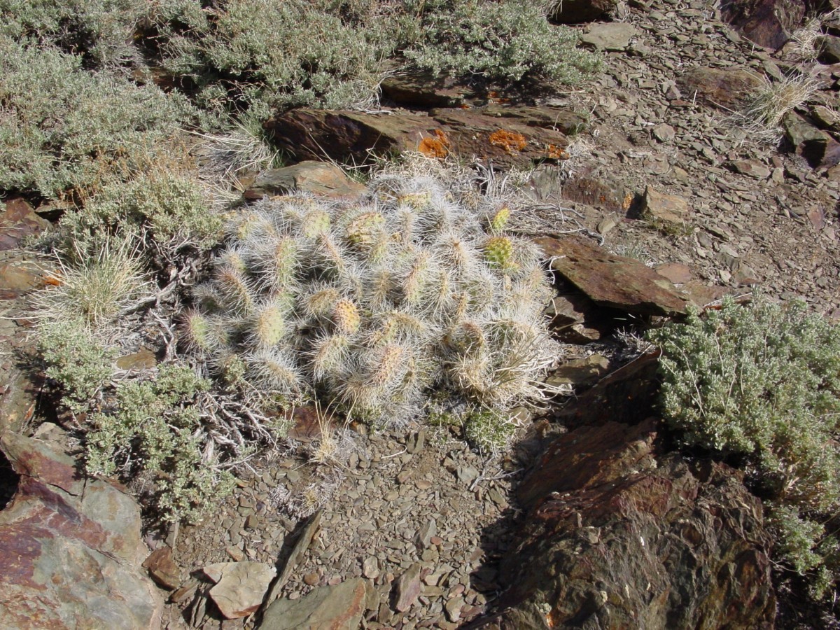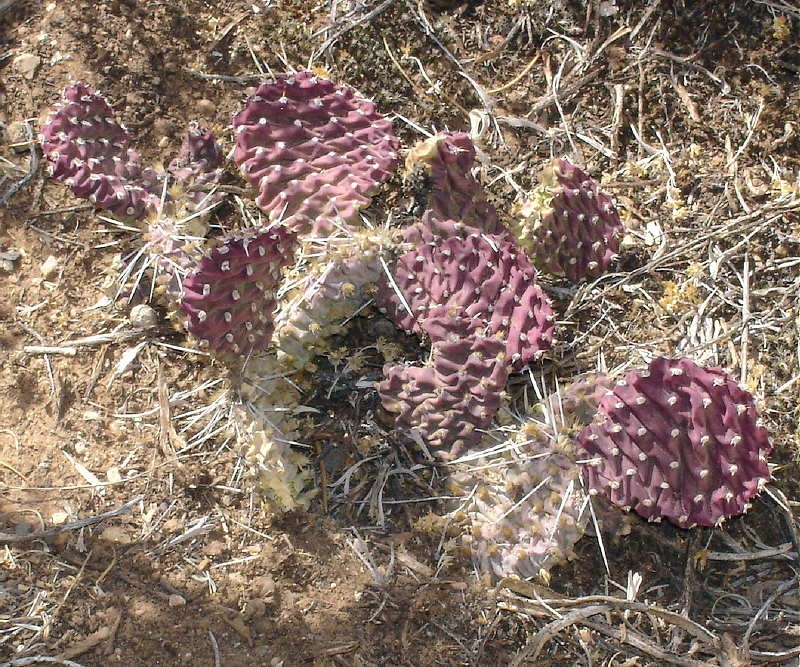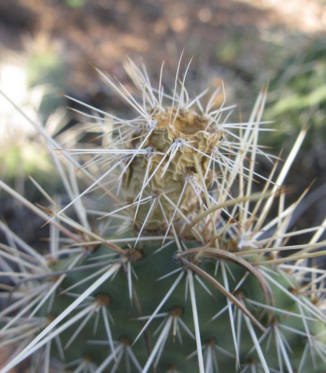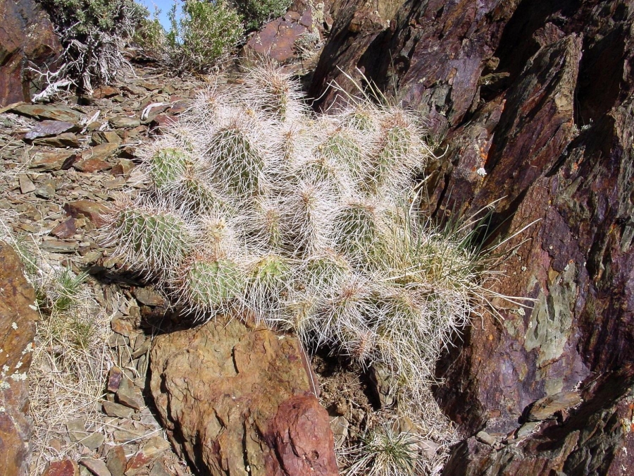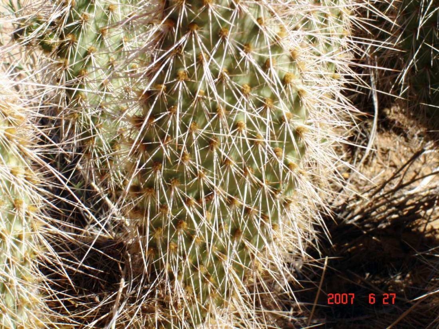 Opuntia polyacantha erinacea has areoles that are usually large and relatively close together. The cladodes are typically very thick and often elongate. The plants tend to form upright clumps. They have many spines, usually mostly slender and terete. The spines can be stiff or hair-like, even on the same plant (some eastern populations of this prickly pear cactus have mostly plants with very thick, stiff, relatively short spines). The spines of this prickly pear cactus vary in color but are often light. The fruit is usually more elongate than in var polyacantha and often reddish when initially ripe (but soon fading to brown or tan as they dry). O. polyacantha erinacea is found in rocky areas (occasionally sandy areas) in the Mojave Desert and on hot rocky south slopes in the Great Basin Desert north almost to (or perhaps into) Idaho. It grows in hotter areas of canyons up the Colorado and San Juan Rivers into southern Utah and almost to the Four Corners in Arizona (it was mostly behind dam building, and populations were destroyed by reservoirs). This Opuntia variety grows in southeastern California, Nevada, northern Arizona, Utah, and Colorado. Plants at high elevations in the Mojave Desert and southern California sometimes spread more than typical plants and sometimes are nearly spineless, whereas some plants at lower elevations may have enough spines to visually obscure the stem. Some botanists consider O. polyacantha var erinacea to be a separate cactus species, but we treat it as a variety of O. polyacantha herein, especially because it intergrades with, and readily interbreeds with, the other varieties.