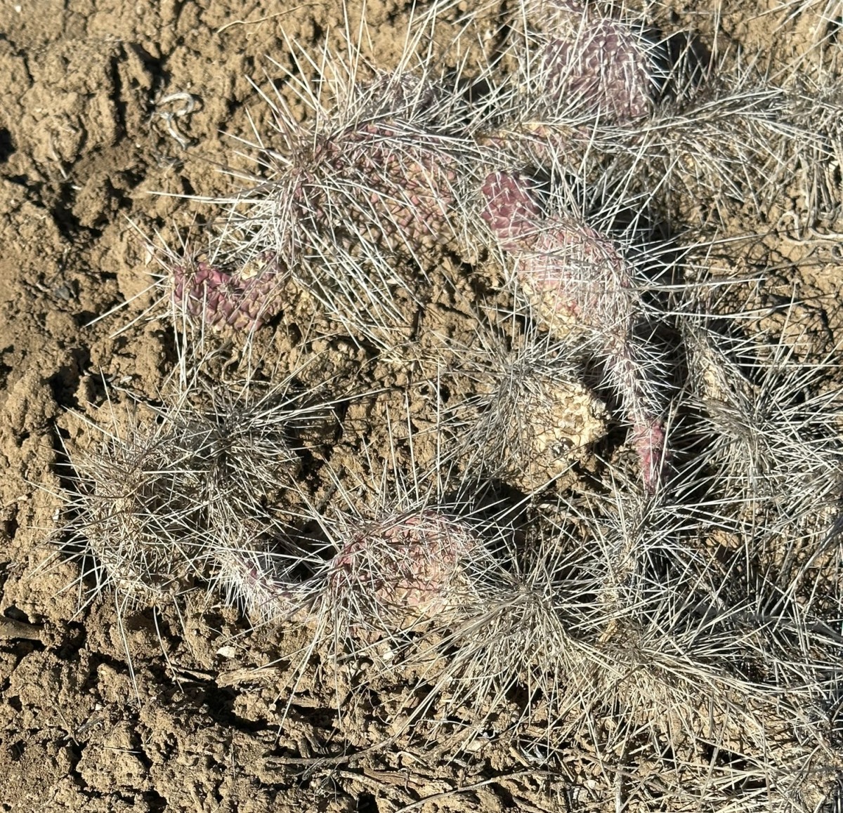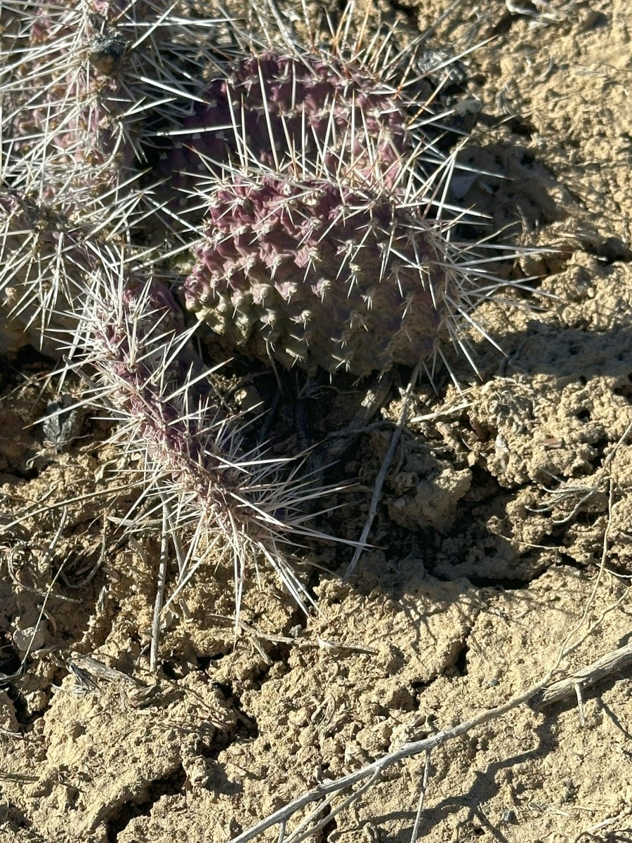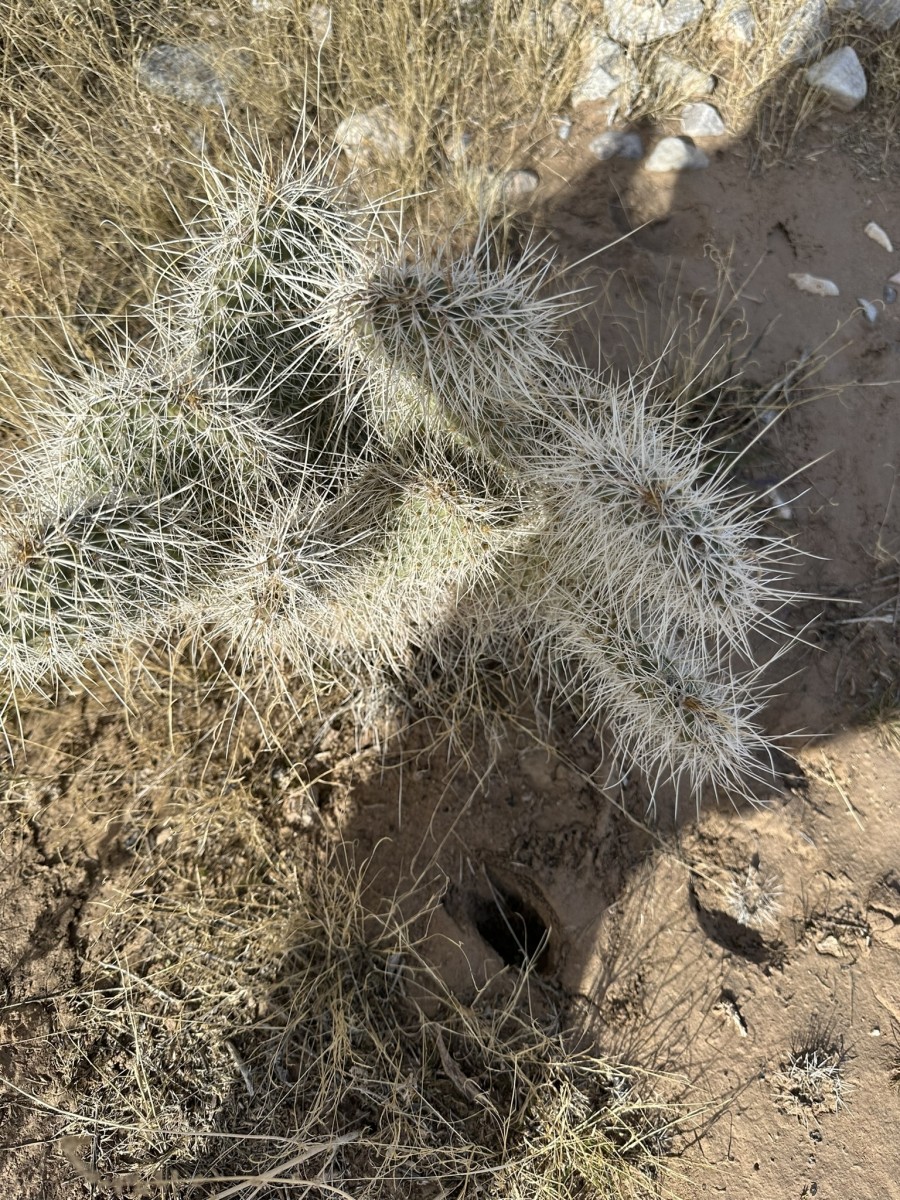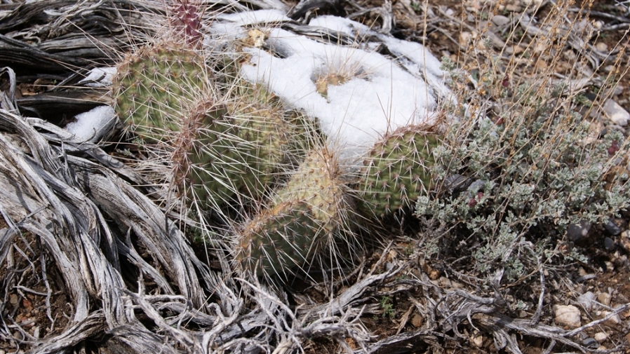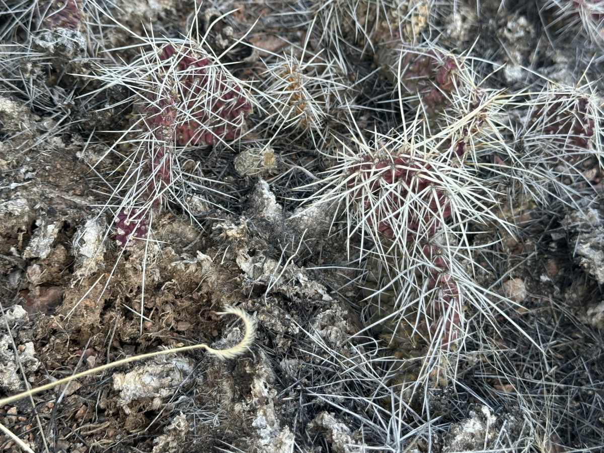 Opuntia polyacantha erinacea has areoles that are usually large and relatively close together. The cladodes are typically very thick and often elongate. The plants tend to form upright clumps. They have many spines, usually mostly slender and terete. The spines can be stiff or hair-like, even on the same plant (some eastern populations of this prickly pear cactus have mostly plants with very thick, stiff, relatively short spines). The spines of this prickly pear cactus vary in color but are often light. The fruit is usually more elongate than in var polyacantha and often reddish when initially ripe (but soon fading to brown or tan as they dry). O. polyacantha erinacea is found in rocky areas (occasionally sandy areas) in the Mojave Desert and on hot rocky south slopes in the Great Basin Desert north almost to (or perhaps into) Idaho. It grows in hotter areas of canyons up the Colorado and San Juan Rivers into southern Utah and almost to the Four Corners in Arizona (it was mostly behind dam building, and populations were destroyed by reservoirs). This Opuntia variety grows in southeastern California, Nevada, northern Arizona, Utah, and Colorado. Plants at high elevations in the Mojave Desert and southern California sometimes spread more than typical plants and sometimes are nearly spineless, whereas some plants at lower elevations may have enough spines to visually obscure the stem. Some botanists consider O. polyacantha var erinacea to be a separate cactus species, but we treat it as a variety of O. polyacantha herein, especially because it intergrades with, and readily interbreeds with, the other varieties.