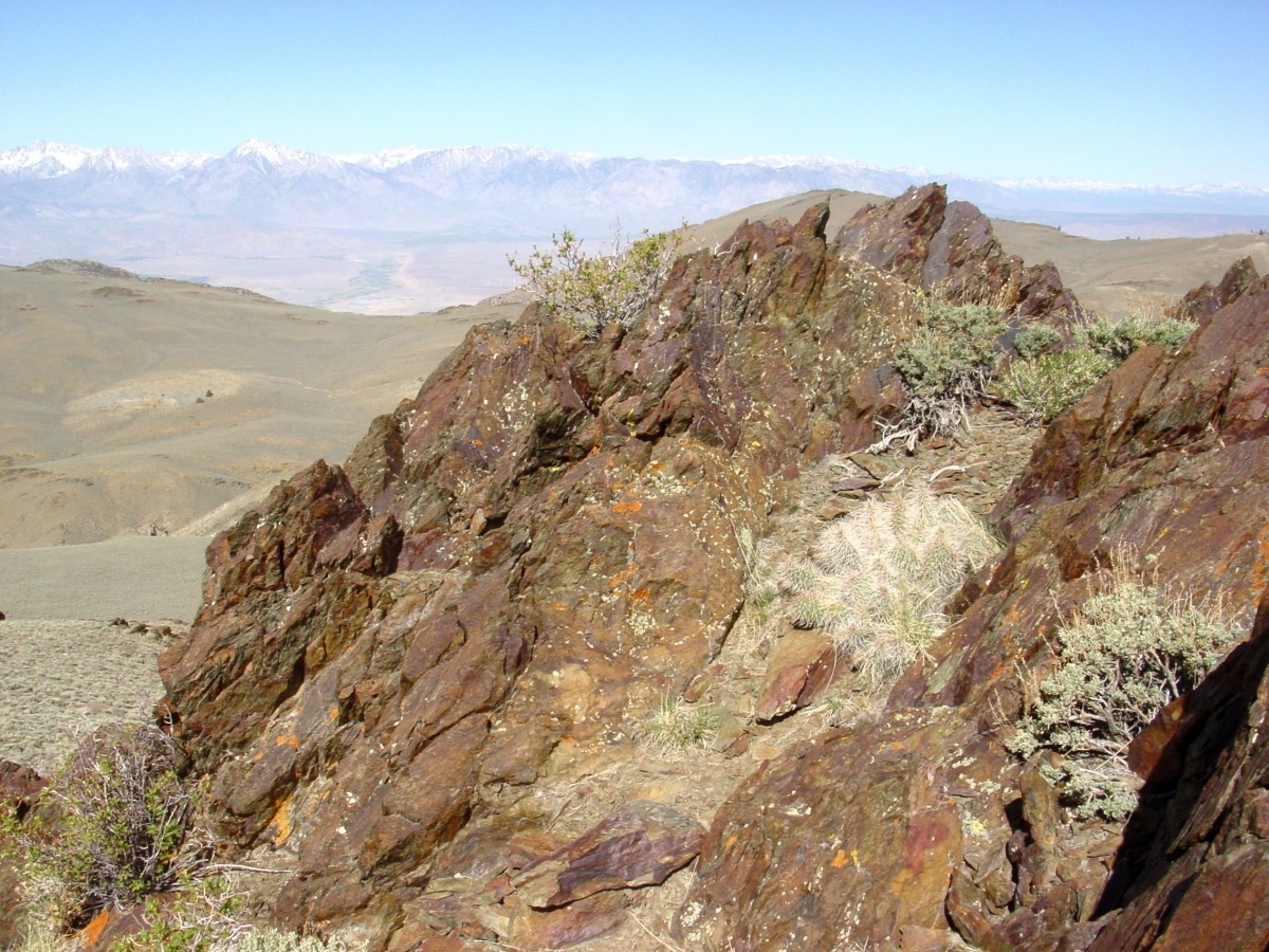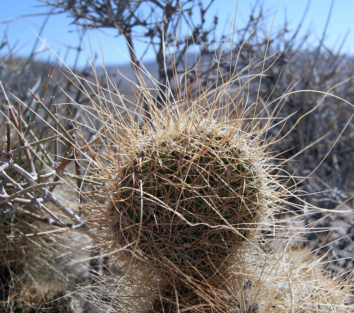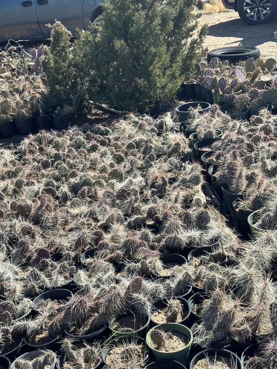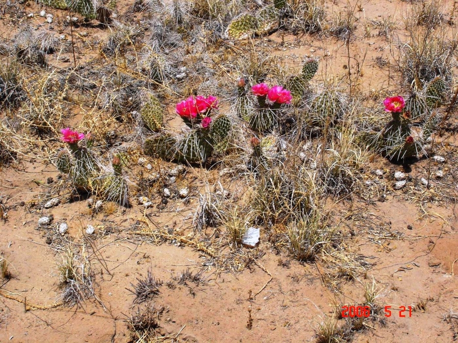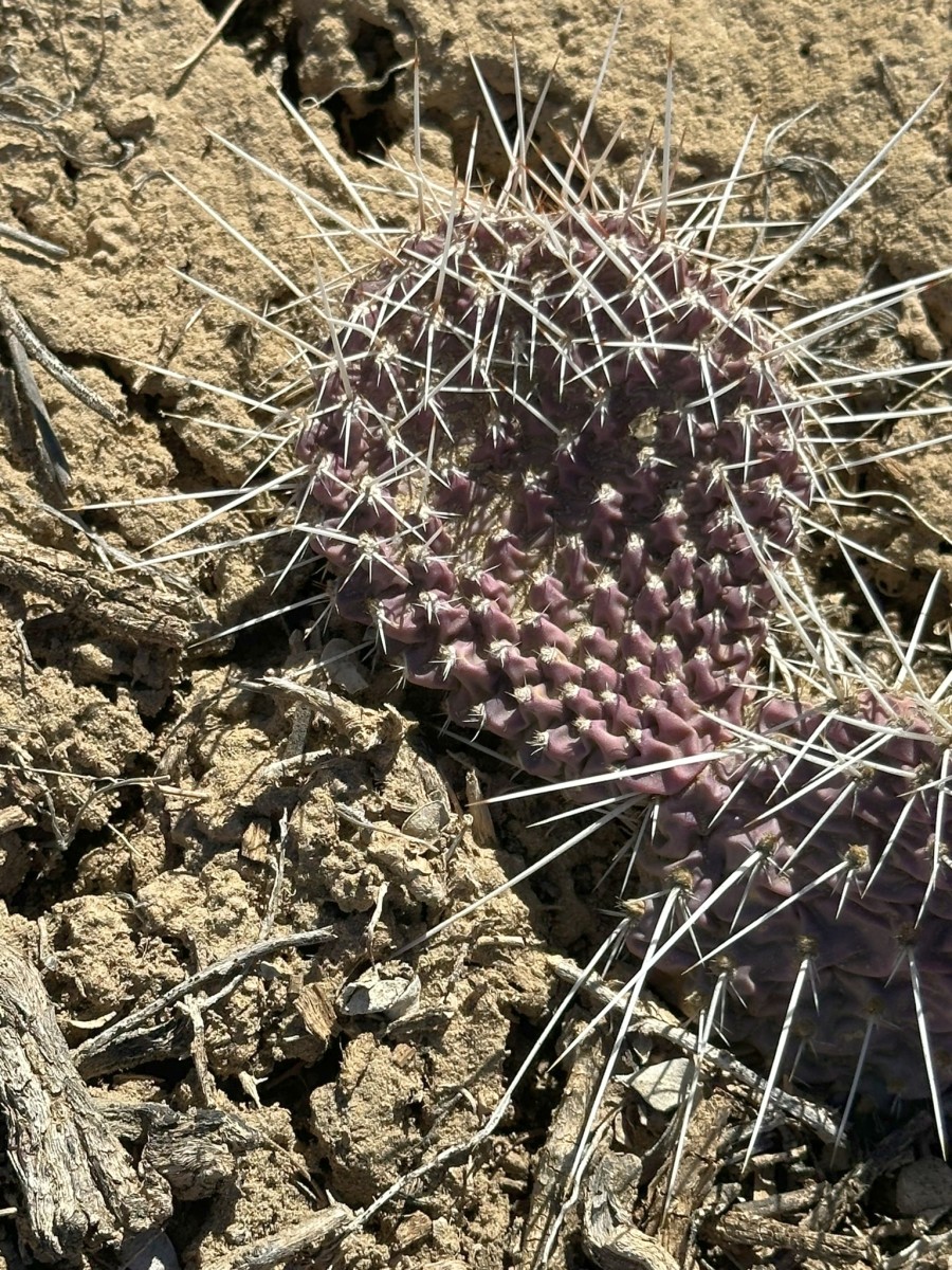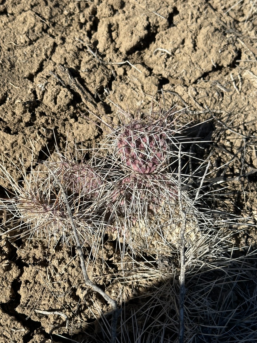 Opuntia polyacantha erinacea has areoles that are usually large and relatively close together. The cladodes are typically very thick and often elongate. The plants tend to form upright clumps. They have many spines, usually mostly slender and terete. The spines can be stiff or hair-like, even on the same plant (some eastern populations of this prickly pear cactus have mostly plants with very thick, stiff, relatively short spines). The spines of this prickly pear cactus vary in color but are often light. The fruit is usually more elongate than in var polyacantha and often reddish when initially ripe (but soon fading to brown or tan as they dry). O. polyacantha erinacea is found in rocky areas (occasionally sandy areas) in the Mojave Desert and on hot rocky south slopes in the Great Basin Desert north almost to (or perhaps into) Idaho. It grows in hotter areas of canyons up the Colorado and San Juan Rivers into southern Utah and almost to the Four Corners in Arizona (it was mostly behind dam building, and populations were destroyed by reservoirs). This Opuntia variety grows in southeastern California, Nevada, northern Arizona, Utah, and Colorado. Plants at high elevations in the Mojave Desert and southern California sometimes spread more than typical plants and sometimes are nearly spineless, whereas some plants at lower elevations may have enough spines to visually obscure the stem. Some botanists consider O. polyacantha var erinacea to be a separate cactus species, but we treat it as a variety of O. polyacantha herein, especially because it intergrades with, and readily interbreeds with, the other varieties.