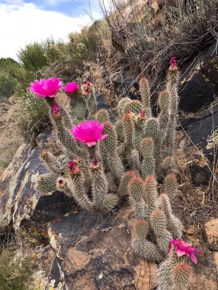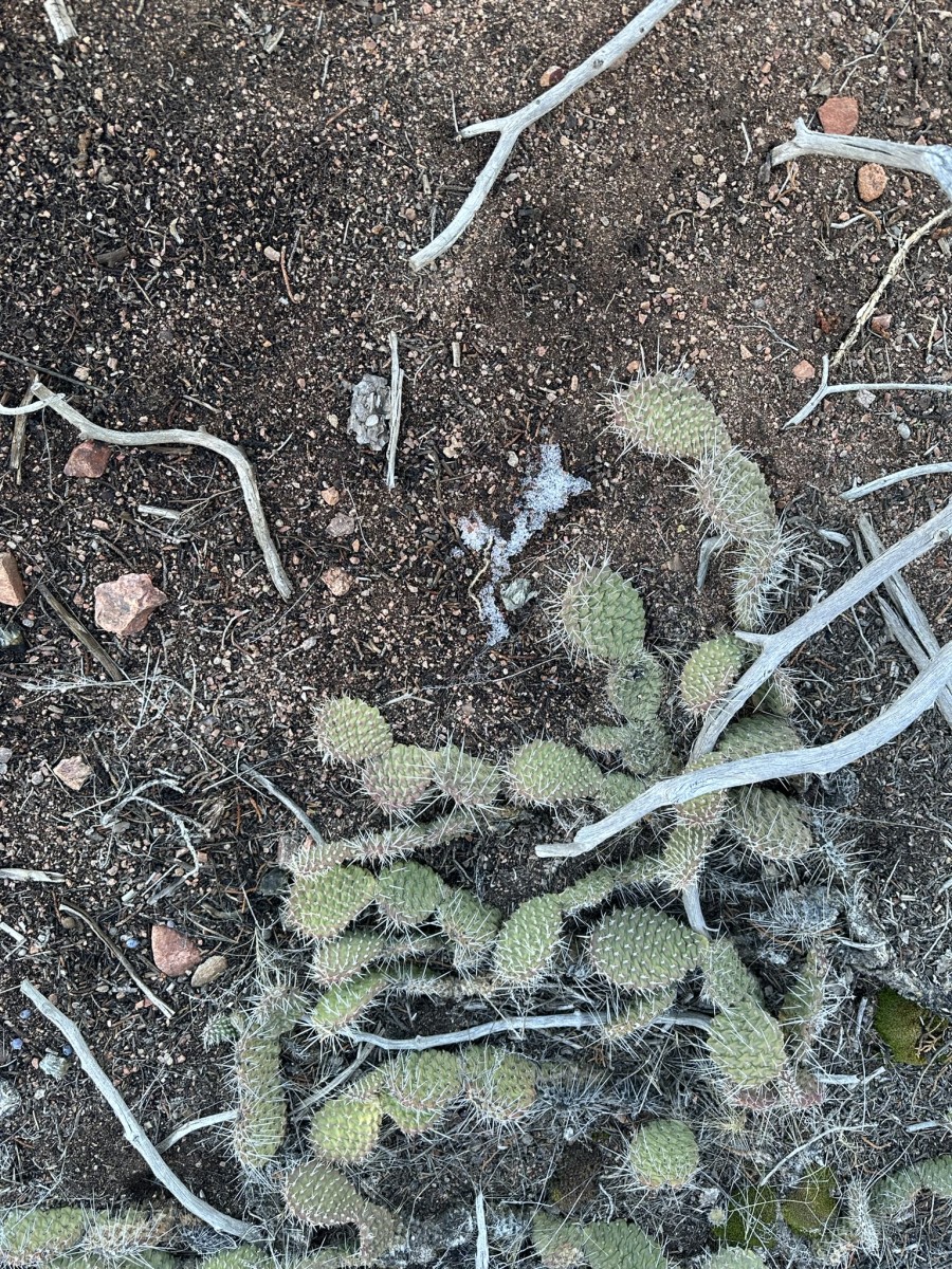 Opuntia polyacantha juniperina is much like var polyacantha in many traits, but it has many fewer spines that are confined to the upper areoles or which may be nearly completely absent. The lower areoles of this Opuntia may have only one or two tiny spines or no spines. The fruit is often spineless or nearly so. This prickly pear cactus is found in mountainous areas of the Colorado Plateaus and Southern Rocky Mountains, but it is rare in the Front Range region. It is found in southern Wyoming, Colorado, eastern Utah, northern Arizona, and northern and central New Mexico. Similar groups of plants are scattered into Idaho, north into northern Wyoming, and in the Black Hills as well as the higher plateaus and mountain country of northern Arizona. It is replaced to the west by var utahensis (the division is the north-south trending, central high plateaus and mountains of Utah). It usually grows in open conifer woodland, mountain scrub, or in areas of sagebrush.