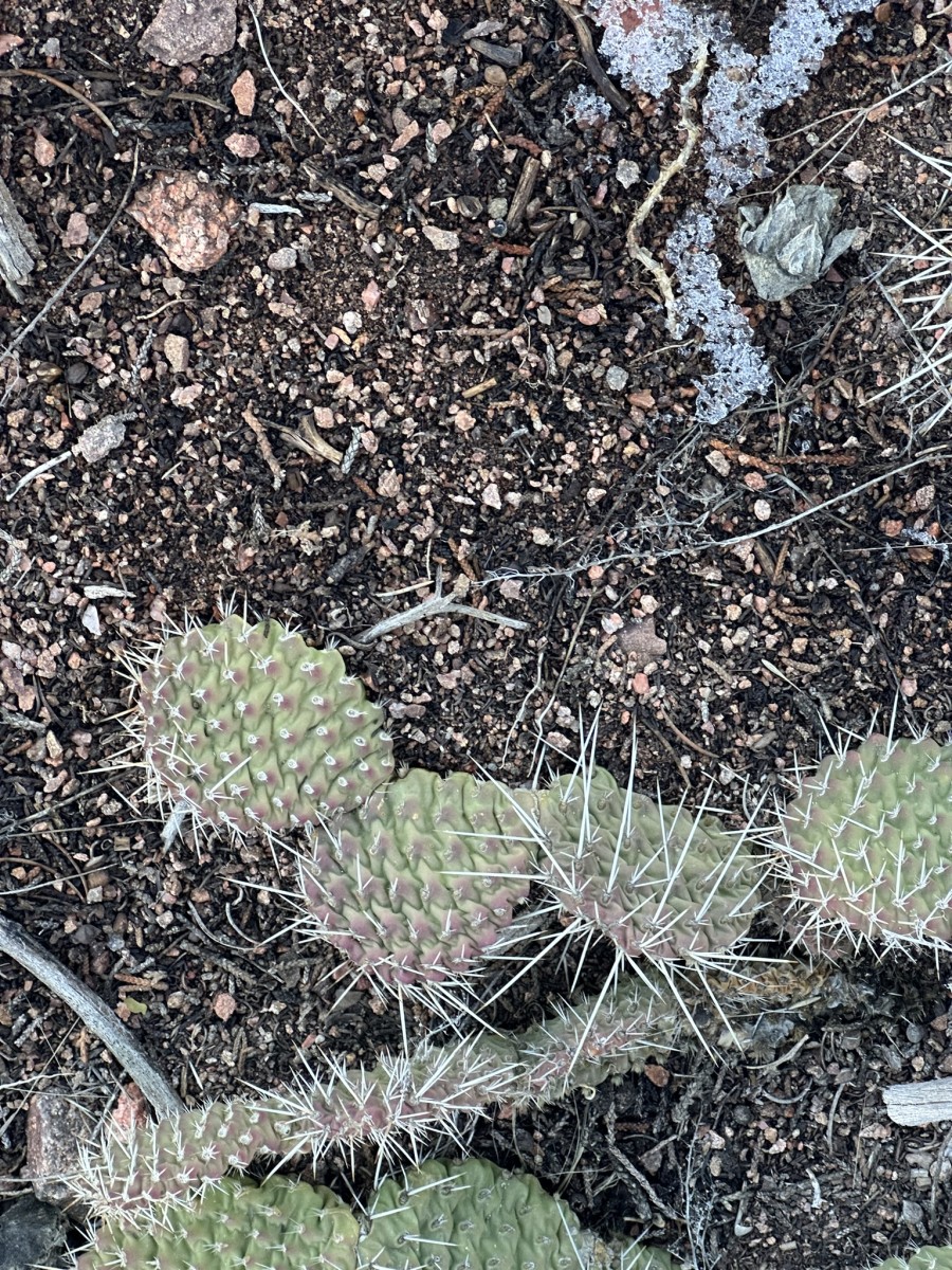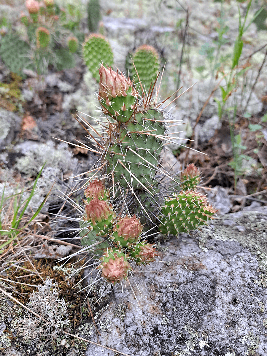 Opuntia polyacantha is a variable prickly pear cactus ranging from Mexico near California, to Texas, to the Rocky Mountain states, the Great Plains, and north into Alberta and Saskatchewan. In 2018, a disjunct population was discovered in the Thousand Islands region of Ontario, Canada. This prickly pear cactus has even been observed in dry areas in Minnesota and Missouri. In 2018, a disjunct population was discovered in the Thousand Islands region of Ontario, Canada (Wikipedia). This Opuntia is much more widely spread than the ubiquitous O. phaeacantha.